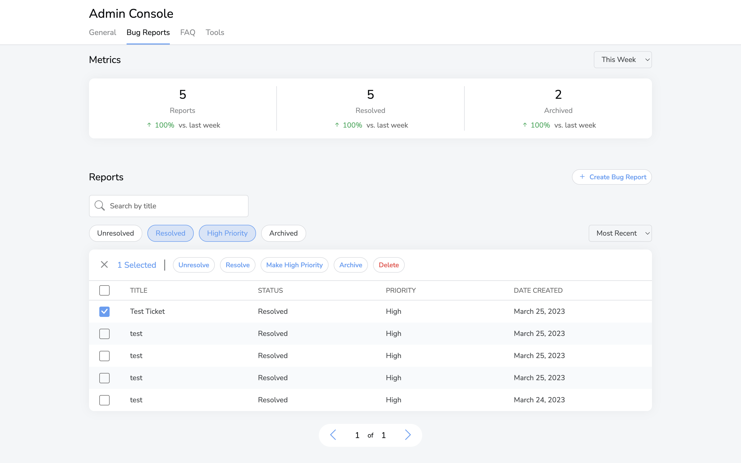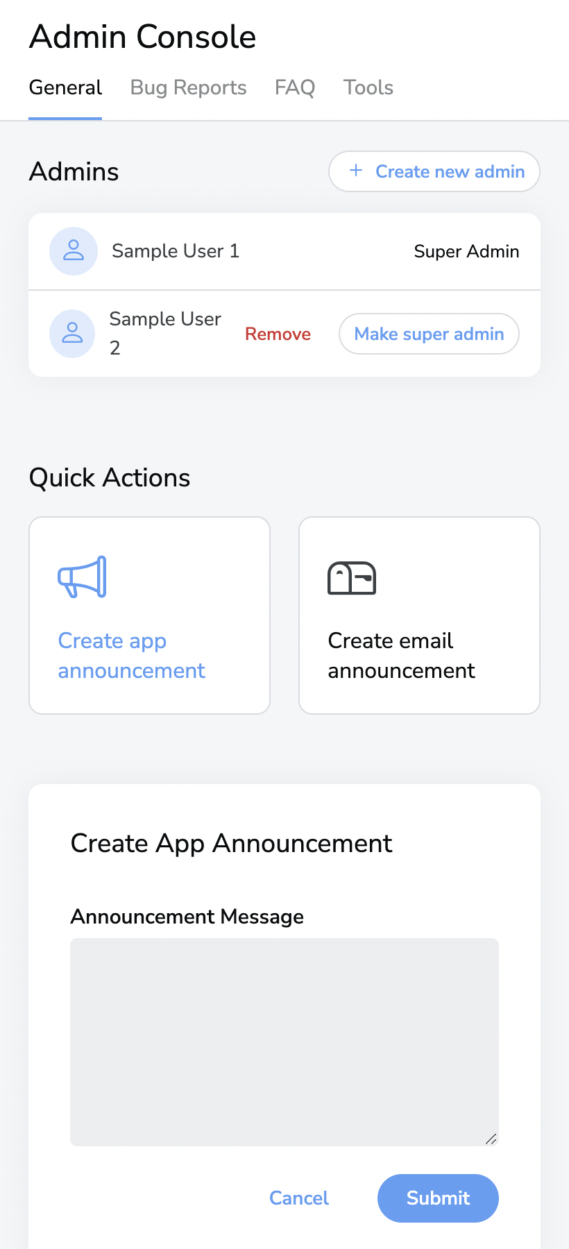 With our pre-built admin console, you'll be able to send announcements to users, track user-submitted bug reports, and view site analytics.